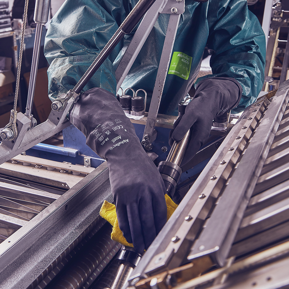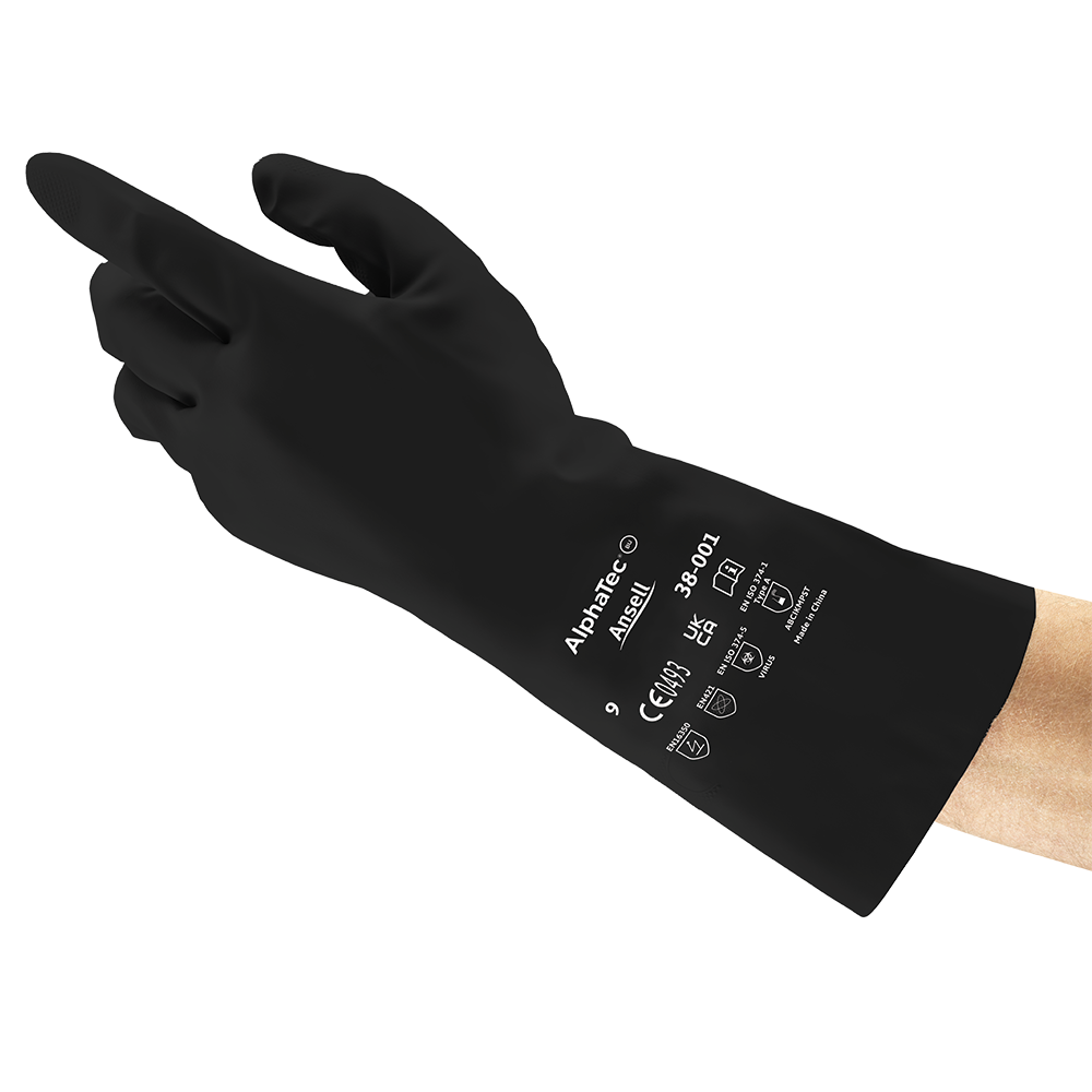Advanced defenses: AlphaTec 38-001’s new water based butyl formulation offers superior protection against highly aggressive chemicals, including aldehydes, ketones, solvent esters and  concentrated mineral acids. Improved ergonomics: Designed for comfort, AlphaTec 38-001 industrial gloves feature a unique butyl formulation to facilitate a soft feel, protecting hands while facilitating donning and doffing. Enhanced flexibility: Ultra soft water based butyl formulation maximizes flexibility and dexterity. Strengthened grip: Features a raised diamond pattern, enhancing grip and ensuring safer handling. Brand: AlphaTec Size: M, L, XL, 2XL Packaging: 1 pair per bag, 36 bags per carton Minimum Order Quantity (MOQ): 1 Pair Unit Of Measure (UOM): Pair