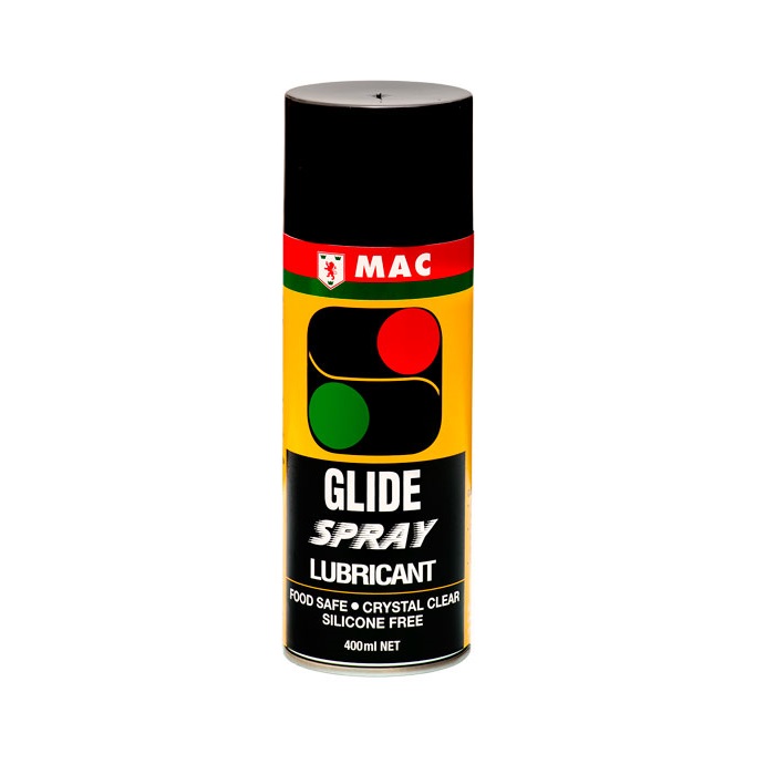 MAC Glide Spray Silicone-Free 400ml provides safe, effective lubrication for food processing, heat sealing, and general manufacturing where MPI C12 approval and zero silicone are essential. A non-staining, colourless and odourless silicone free slipping agent Does not impair subsequent sealing, gluing, painting or printing operations Displaces moisture, penetrates, lubricates, and protects Made with high-grade white oil + rust inhibitors Frees seized bolts, hinges, and fittings Long-lasting barrier against rust and oxidation Safe on metals, plastics, paints, fibreglass, and seals Non-conductive, non-toxic, won’t gum up or wash off Contains no silicone, acid, kerosene, or dieselene Developed primarily for the manufacturing industry where silicone based lubricants cause post finishing difficulties High surface lubricating properties Stable up to 250°C Available in 400ml aerosol 5L, 20L & 200L fluid drums Made in New Zealand MPI approved C12 AsureQuality approved Food/Beverage/Dairy Stock#: GLIDE4A, GLIDE20B Variant/Size: 400ml Quantity: 12 Gr.Wt (Kg): 4.490 Vol (m3): 0.012
