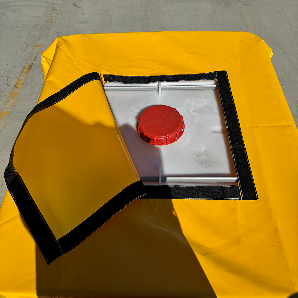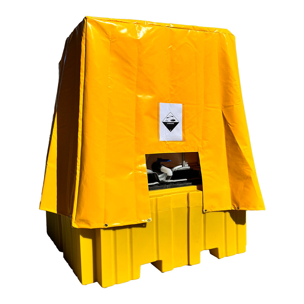 Protect IBCs stored outside from the elements and stop the spill pallet filling with rainwater with an Ultra Pull Over Cover for IBC spill pallets. Made from a ripstop PVC that is fire resistant and in accordance with the German FR-B2 standard. Comes with a 3 year UV warranty. Dimensions: (Top 130cm W x Base 165cm W x 147cm H) Weight: 4.5kg Brand: UltraTech Unit Of Measure (UOM): Each